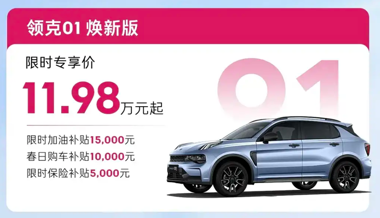 限时11.98万起,叠加加油补贴15,000元 + 购车补贴10,000元 + 保险补贴5,000元,综合让利3万元。10万级合资SUV(如CR-V、RAV4)的丐版价格,能买到领克01的2.0T+8AT+沃尔沃同源安全架构,性价比相当高。适合首购年轻人或家庭的第二台车。