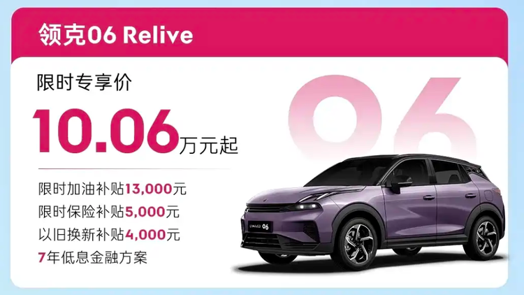 领克06 Relive(10.06万起):同03补贴,小型SUV灵活好停车。