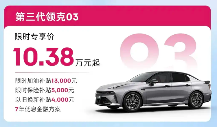 第三代领克03(10.38万起):加油13000+保险5000+置换4000,合计2.2万,燃油轿车里的稳当选择。