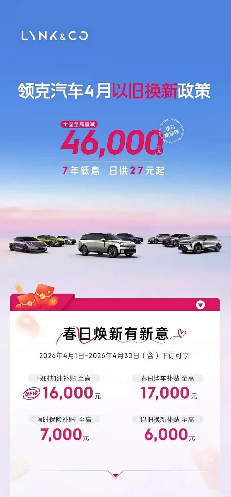 4月份,领克推出“以旧换新”促销季(4月1日-4月30日),全系至高直降4.6万元,叠加7年低息、日供27元起。但仔细拆解各车型补贴后你会发现:力度严重分化。有的车补贴堆满,堪称“价格屠夫”;有的车只是象征性让利,不值得为它专门跑一趟。下面我就来给大家简单地解读下。