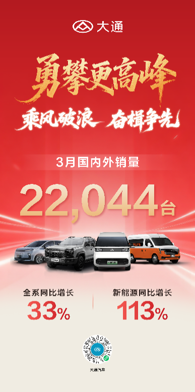 海内外双破万,一季度稳健收官。3月,上汽大通全系热销2.7万辆,同比增长32%,其中新能源销量9,169辆,同比增长89%。国内、海外销量均突破万辆,海外同比大增32%。大通新能源销量同比增长113%,跃进新能源销量同比增长49%。大拿系列销量创历史新高、同比大增超300%领跑新能源轻客市场,跃进引领轻卡新能源转型。一季度稳健收官,为全年发展筑牢根基。