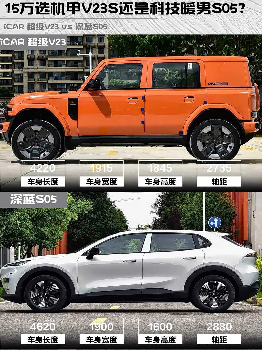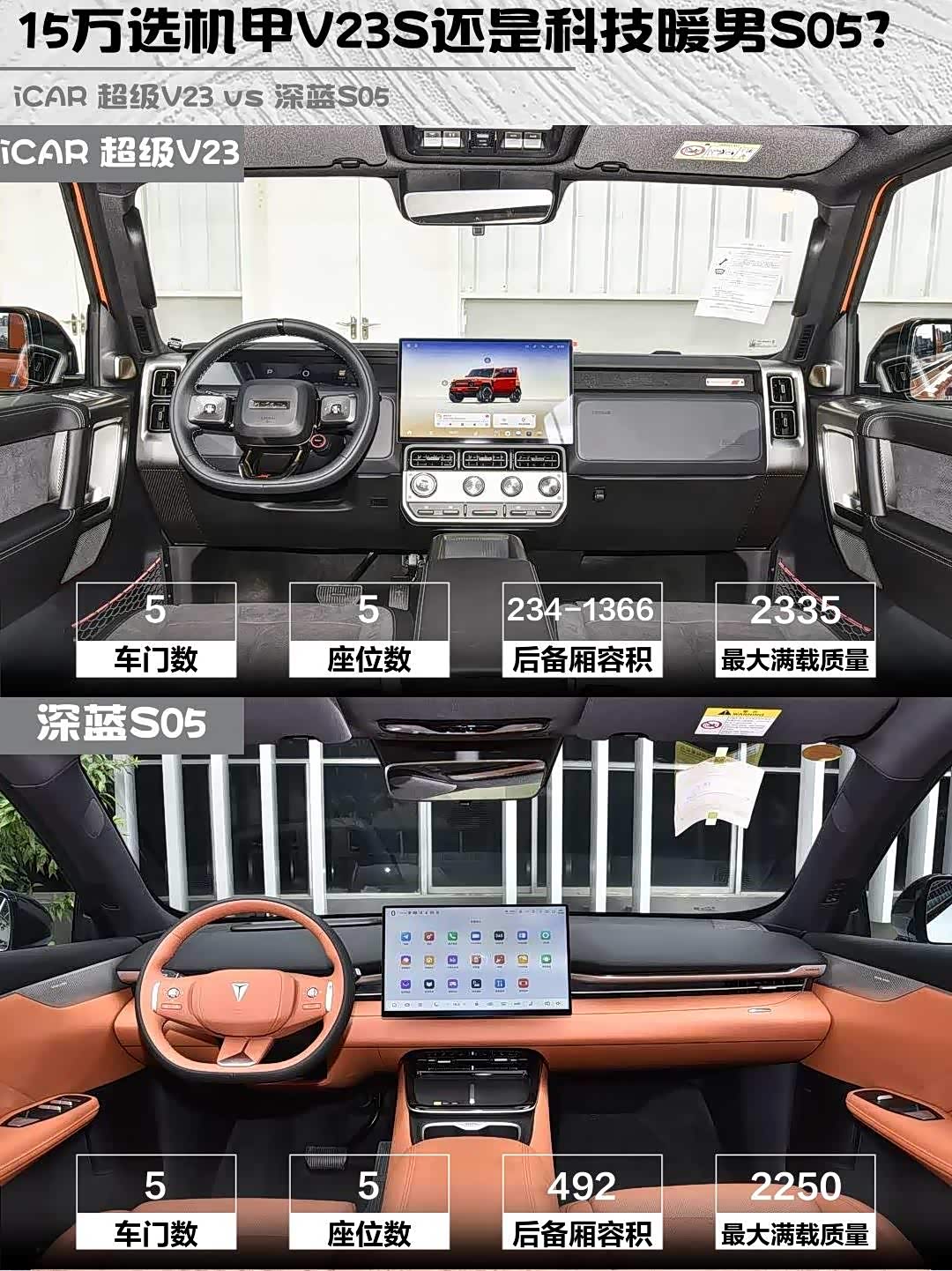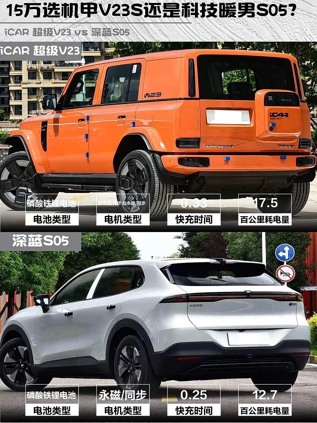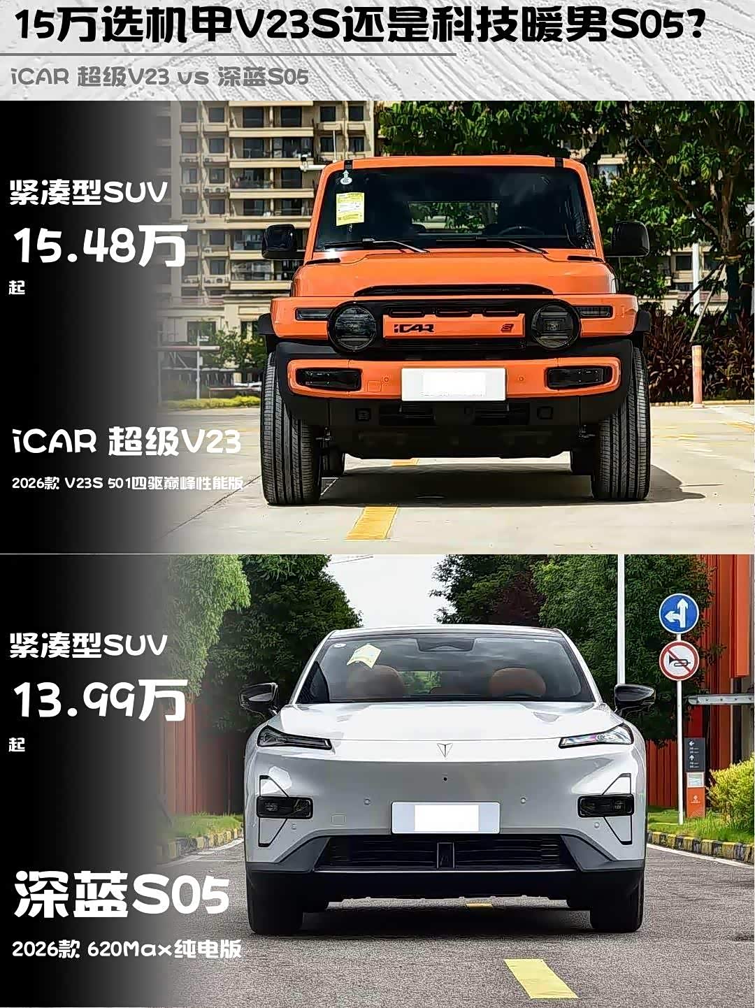 车家号·0浏览·2026-04-05 08:15 · 北京最近试驾了两款15万级纯电SUV, iCAR 超级V23(参数|询价) 2026款 V23S 501四驱巅峰性能版和深蓝S05 2026款 620Max纯电版,发现它们简直是性格迥异的两兄弟!🤔