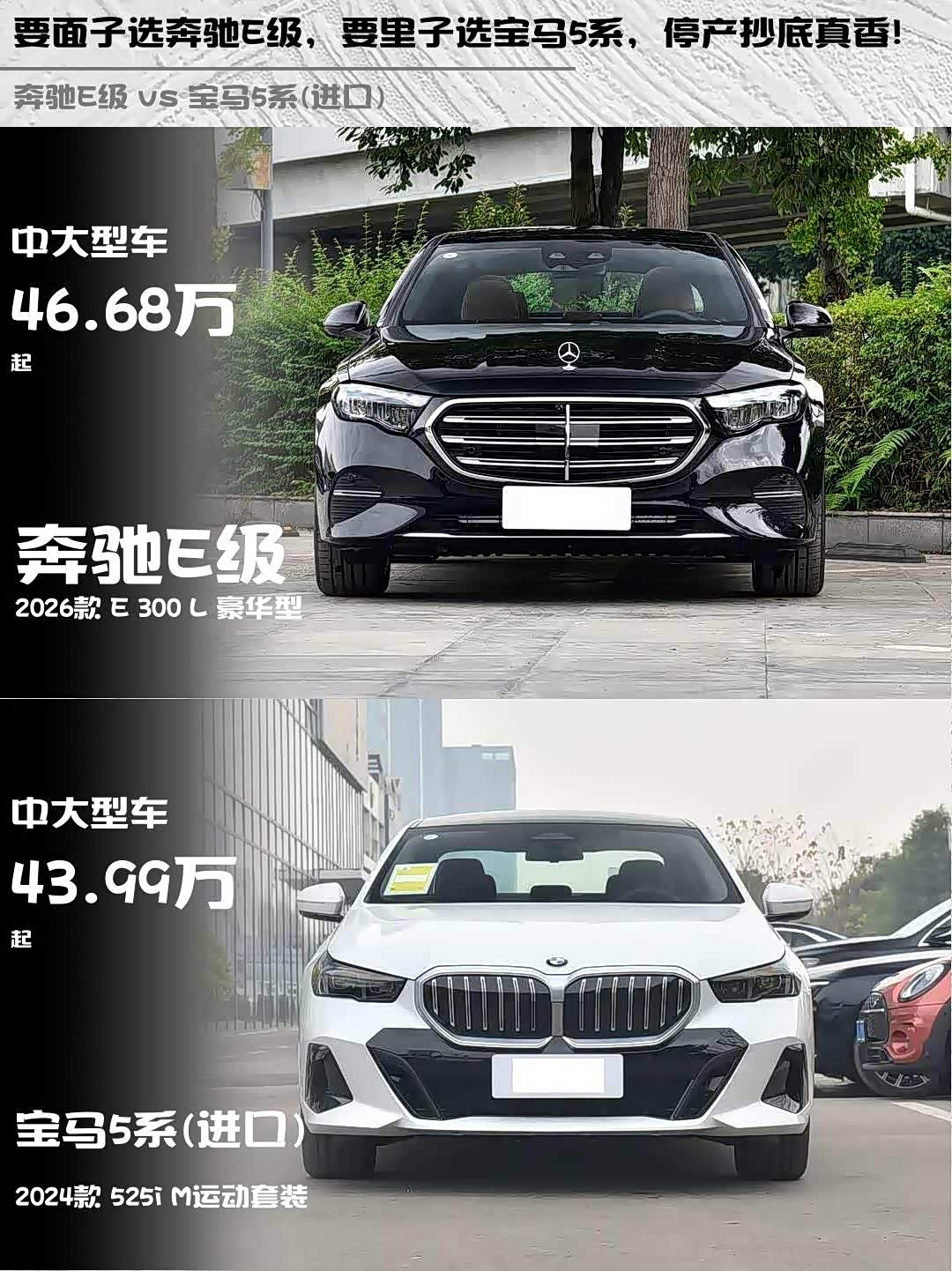 要商务接待/家庭出行选E 300 L:空间奢侈配置全,立标气场两米八。追求驾驶乐趣选525i:标轴车身更灵活,M运动套件颜值炸街。不过现在两款都是停产在售,抄底价可能更诱人哦!