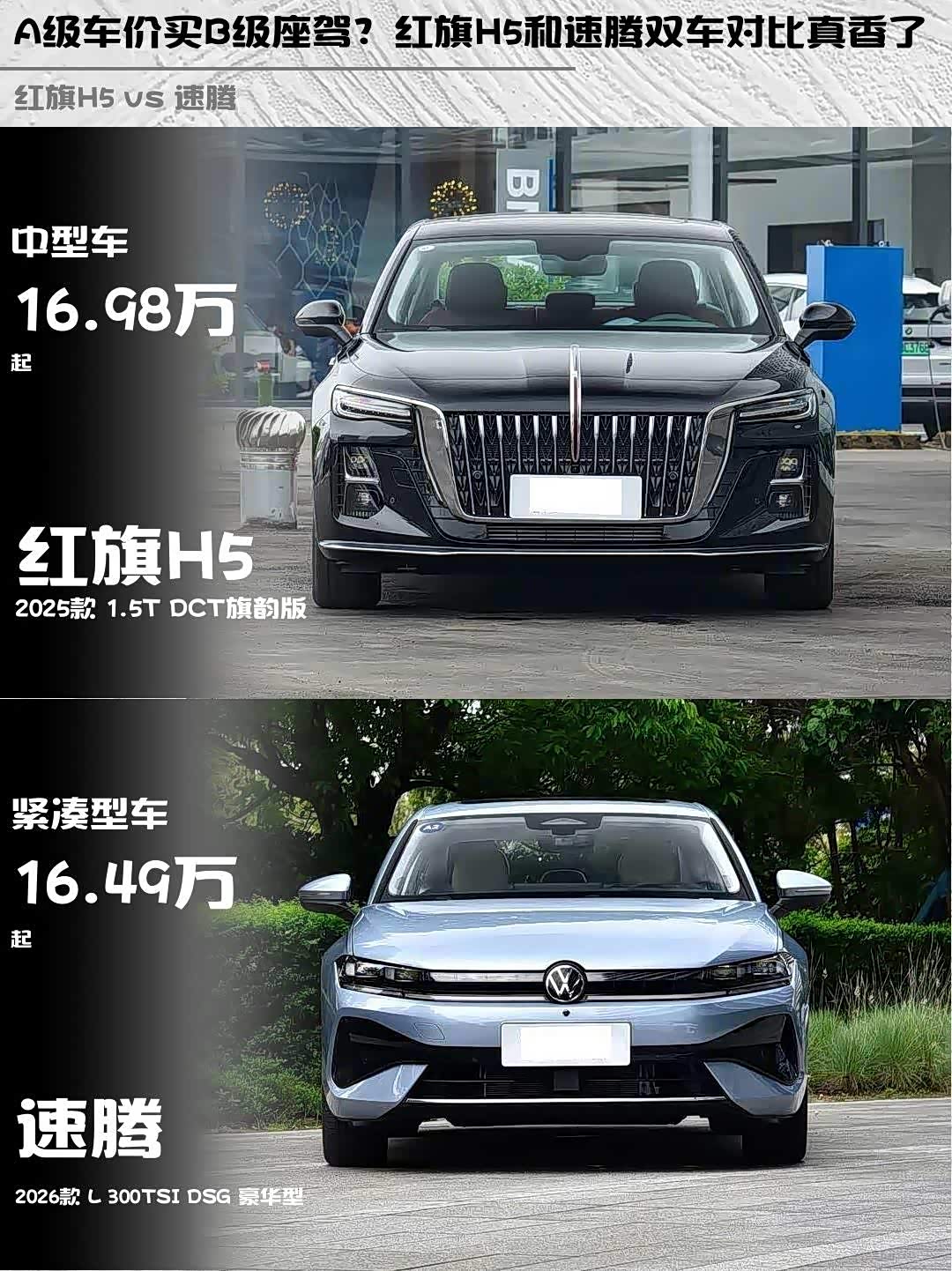 车家号·0浏览·2026-04-05 08:37 · 北京最近在选家用轿车,纠结 红旗H5(参数|询价) 2025款 1.5T DCT旗韵版和速腾2026款 L 300TSI DSG 豪华型,深度试驾后说说真实感受👇