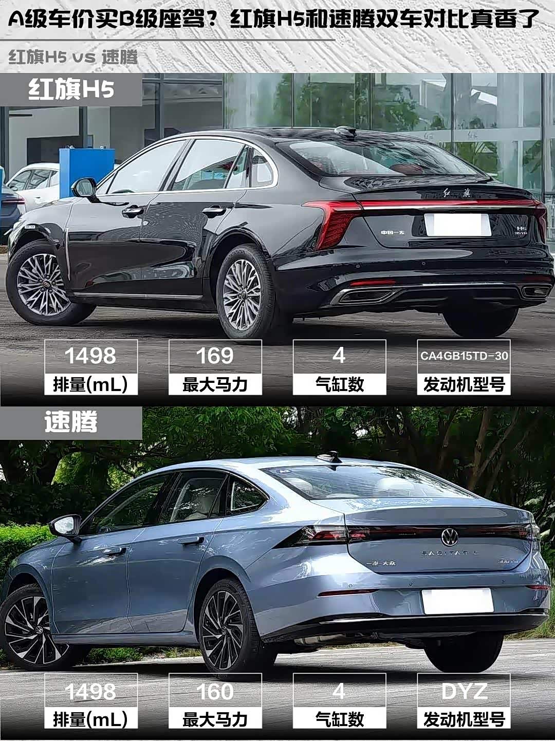 1.5T发动机参数接近(红旗169马力/速腾160马力),但红旗湿式双离合低速更顺,速腾干式双离合堵车时轻微顿挫。底盘方面红旗偏舒适,过减速带像坐船;速腾德系调校更硬朗,过弯支撑性强。