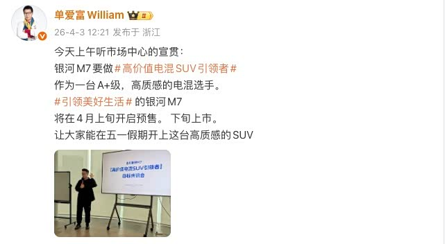 近日,吉利汽车传播策略部长、吉利银河公关部长单爱富在个人社交平台透露,吉利 银河M7(参数|询价)将于4月上旬开启预售,下旬正式上市,并计划在五一假期前启动交付。这意味着,对这款新车感兴趣的消费者,有望在节前开上实车。