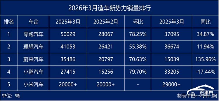 日前,造车新势力陆续发布了2026年3月交付成绩。在节后复工提速、以旧换新政策落地、春季车展前新车集中上市等多重因素推动下,新势力交付数据迎来明显反弹。这其中,零跑以50029辆稳居榜首;理想重回4万大关;蔚来销量增速亮眼;小鹏和小米激战“2万+俱乐部”。