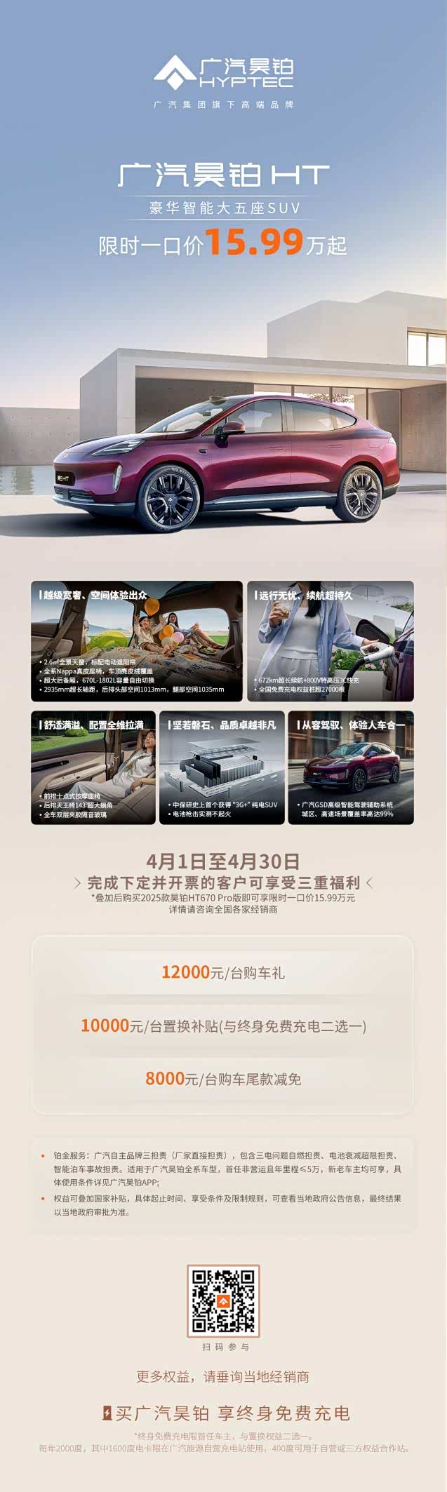4月1日至30日期间,广汽昊铂推出重磅限时优惠活动。购买2025款昊铂HT 670 Pro版,可叠加享受12000元/台购车礼、10000元/台置换补贴(与终身免费充电二选一)、8000元/台购车尾款减免这三重福利。经过这一系列优惠叠加后,消费者仅需15.99万元就能将这款豪华智能大五座SUV开回家。如此力度的优惠,无疑让昊铂HT在15万左右SUV市场中脱颖而出,成为消费者购车清单上的首选。
