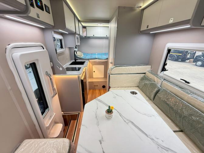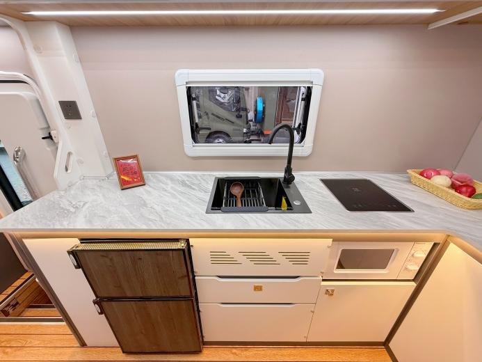 后厨卫布局:以功能型为核心,打造流畅的做饭动线与独立的洗漱空间。集中式收纳设计提升长途旅居舒适度,适合两至四人出行、热爱烹饪且重视隐私的用户。
