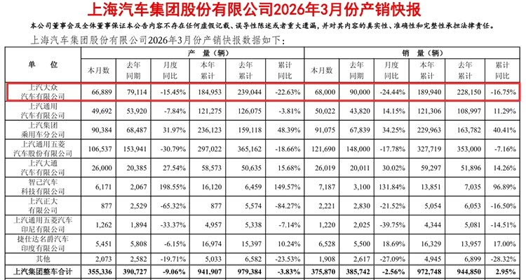 作为上汽集团的销量功臣之一,由奥迪、大众品牌、斯柯达组成的上汽大众,3月销量68000台,同比下滑24.44%,今年1-3月累计销量189940台,同比下滑16.75%。说实话,这已经是上汽大众连续多个月出现单月销量同比下滑了。