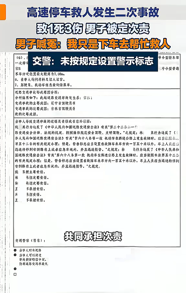 认定责任的吉林高速支队巡逻五大队相关负责人回应称:责任认定是大队和事故处理部门共同商议得出的,依据完整的现场勘验、多方调查取证和过路司机证言,认定流程严谨、公平公正,完全经得起核查。认定徐先生担责的依据之一是未按照规定设置警示标志,具体的专业关联涉及技术细节,事故案件材料多达一百多页,具体不便透露。