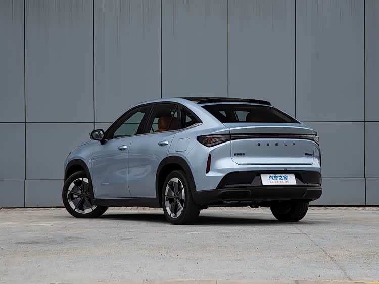 再来看车身侧面部分,博越REV采用标准紧凑型SUV比例,车身尺寸长宽高是4680*1892*1650mm,轴距2778mm,修长的车身线条搭配流畅的车顶弧度,从B柱开始缓慢下压,营造出略带溜背的动感姿态,同时不牺牲后排头部空间。车门采用隐藏式门把手设计,降低风阻的同时提升科技感;车身腰线采用双段式设计,上腰线从前翼子板贯穿至车尾,下腰线则强化侧面层次感,搭配黑色轮眉与侧裙护板,凸显 SUV 的越野属性。车窗边框辅以镀铬饰条包裹,C 柱位置加入专属 “REV” 混动标识,彰显车型身份,整体侧面设计简洁大气。