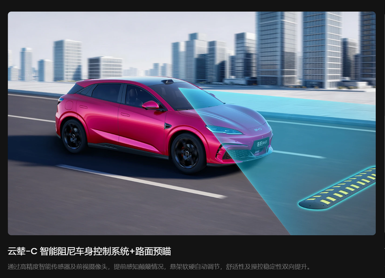 底盘方面,新车采用前双球节麦弗逊后五连杆独立悬架,标配云辇-C智能阻尼车身控制系统,还加入了路面预瞄功能。云辇-C听起来挺玄乎,本质上是一套能根据路况实时调节悬架阻尼的智能系统——遇到颠簸时变软吸收震动,高速过弯时变硬稳住车身。把这项技术下放到13万级别的车上,确实是比亚迪的一个狠招。
