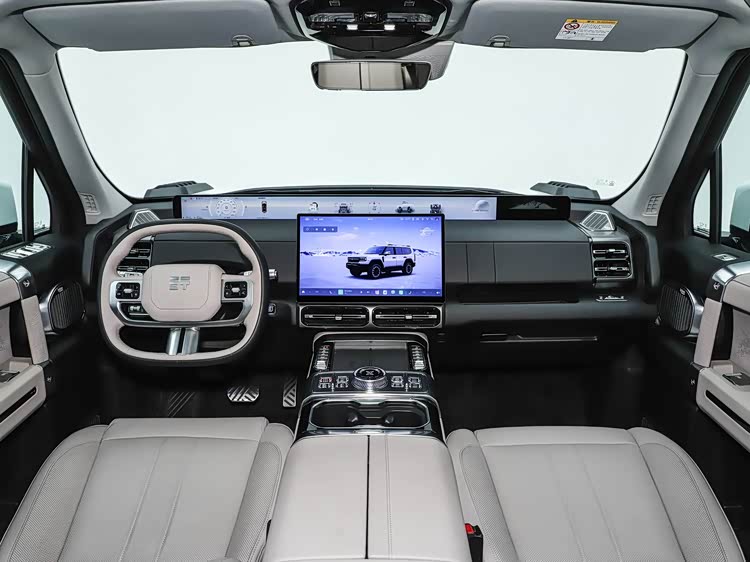 进入车内,内饰主打纵横灵感座舱,环抱式布局 + 硬派豪华双风格,用料与配置拉满。中控台采用分层设计,核心是35.4 英寸贯穿式山脉天际屏(仪表 + 副驾屏)+15.6 英寸悬浮中控屏,双联屏科技感爆棚,搭载银河 OS + 华为鸿蒙生态,支持 5G、语音交互、OTA、越野专属 UI,响应精准、功能全面。空间方面,5座版后排中间地台纯平,满载3人无压力,6座版二排独立座椅,进出三排便捷,适合多人口家庭。后备箱常规容积580L,2/3排放倒可拓展至 2100L。