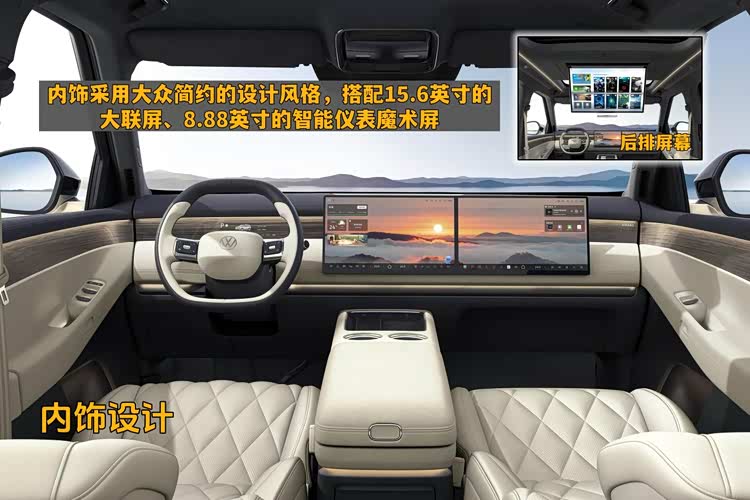 内饰方面,依旧是大众简约的设计风格,但是加入了很多当下流行的设计语言,比如双15.6英寸的大联屏、8.88英寸的智能仪表魔术屏、21.4英寸的3K后排屏幕和双向冷暖冰箱以及255色氛围灯。