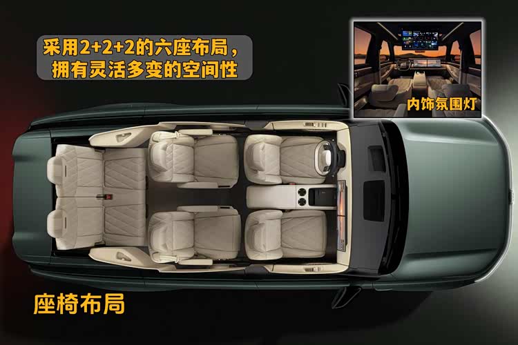 在空间方面,这款车采用了2+2+2的六座布局,并且当下流行的后排尊享模式、小憩模式、大床房模式等也都能轻松实现。全车配备了10个安全气囊,并且值得一提的是,在配备AEB自动紧急制动的基础上,它还搭载了高阶TPMS爆胎稳定控制系统,为我们的出行保驾护航。