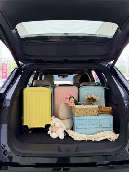 后备箱也很能装,达到773L。有人做过实验,20寸的行李箱能放13个。而且还有下沉式储物空间和前备箱,分类放置物品很实用。