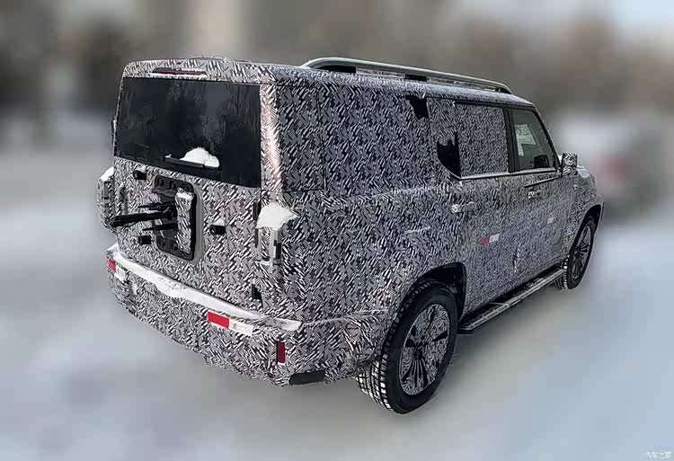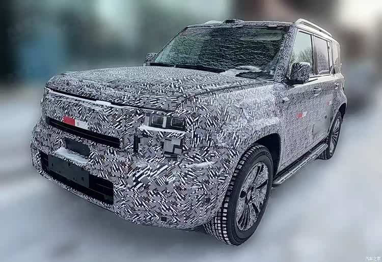 从曝光的谍照来看,新车彻底摆脱了传统城市SUV的圆润风格,采用当下热门的方盒子硬派造型,整车线条硬朗笔直,车身轮廓魁梧大气,尽显硬核气场。车头部分搭载矩形大灯与半封闭式格栅,搭配厚实的下包围,兼具新能源车型的科技感与硬派越野的力量感;车身尺寸方面,新车车长预计超过5米,车宽接近2米,属于标准的中大型SUV体量,侧面配备固定式脚踏板,方便乘客上下车,同时保留传统机械式门把手,兼顾实用性与复古质感。尾部设计同样亮点十足,不仅保留外挂式备胎接口,还采用侧开式尾门设计,进一步强化了硬派越野属性。