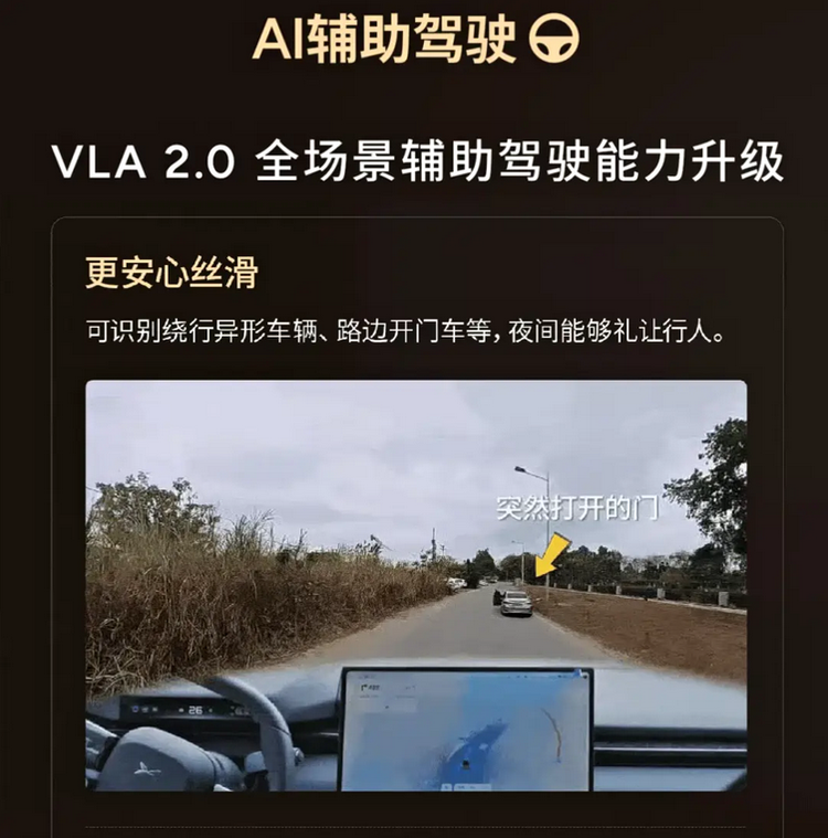 在本次6.1.0版本中,第二代VLA 2.0智能驾驶系统成为核心调整方向。从技术路径来看,该系统侧重视觉语言融合能力,通过多传感器数据与算法模型协同,对道路环境进行更细颗粒度的识别。在实际道路环境中,这种升级主要体现在对非标准目标的识别能力,例如异形车辆、临停车辆以及开门状态的车门等。系统在处理这类目标时,路径规划更加连续,避免频繁减速或不必要的急刹操作。从驾驶体验角度来看,这类优化有助于减少系统介入时的突兀感,使车辆行驶逻辑更接近人类驾驶习惯。