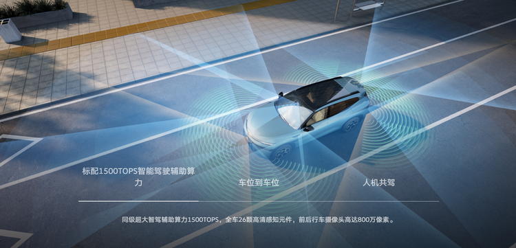 智能配置是这车最大的亮点之一。全系标配小鹏汽车的VLA全场景驾驶辅助系统,搭载双AI图灵芯片,总算力达到1500TOPS。感知硬件有11个摄像头、3个毫米波雷达、12个超声波雷达,一共26个。支持高速NOA、城市NOA、车位到车位的全场景辅助驾驶,还有“人机共驾”模式——你随时可以手动接管方向盘,系统不退出也不对抗,体验上更接近有一个副驾在帮你。座舱里还集成了百度文心一言和智谱GLM双大模型语音助手。