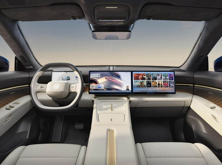 外观设计上,这台车确实不像传统大众。俯冲式的封闭前脸,上扬的水晶日行灯,中间是可发光的金色VW标,还支持3种迎宾交互灯语。尾部有个“狼标”高位刹车灯,这是致敬沃尔夫斯堡经典设计的细节。整体来看,大众这次确实想摆脱“套娃”的老印象。