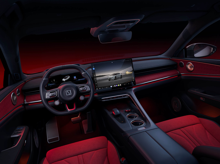 进入车内,极氪001五周年纪念版采用了经典的黑红撞色搭配,大面积黑色软性材质和红色Alcantara面料进行了完美缝合,还加入了银色的金属装饰条,亮黑色钢琴烤漆饰板,标配了黑色皮革+红色绒布拼接的前排桶装赛车座椅,还在肩颈腰臀腿进行了加宽处理,加入了宽大的侧翼,提供了更好的包裹和支撑。采用定制星空音乐厅座舱组合,配备浩瀚星空顶、水墨色LV分区调光天幕,以及4680瓦29扬声器7.1.4.8全景声音响系统。中控台采用了非对称设计,配备了16英寸3.5K超清向日葵中控屏、39.3英寸AR-HUD抬头显示、13.02英寸高清机长仪表与8英寸后排娱乐控制屏,可以实现多屏联动。操控性方面,配备了上下削平的多功能方向盘,还加入了红色金属元素点缀,操控岛配备了符合人体工学的换挡手柄,手机无线充电、两个标准的杯架。智能方面,新车搭载Zeekr AI OS 7原生AI智能座舱系统,同时配备千里浩瀚H7 G-ASD驾驶辅助系统,硬件与软件配置同步升级。