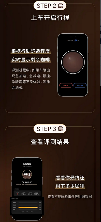 在实际使用层面,用户通过微信进入小程序后,只需将手机平放在车内中控台或扶手区域,系统便默认生成一杯“100%满载”的虚拟咖啡。车辆启动后,小程序开始持续记录行驶过程中的加速度变化,包括纵向的加减速、横向转向以及垂向振动等关键维度。这一过程并不依赖车辆原生数据接口,而是通过手机传感器完成采集,降低了使用门槛,但同时也意味着测试结果更接近“体感模拟”,而非车辆底层控制系统的原始数据输出。