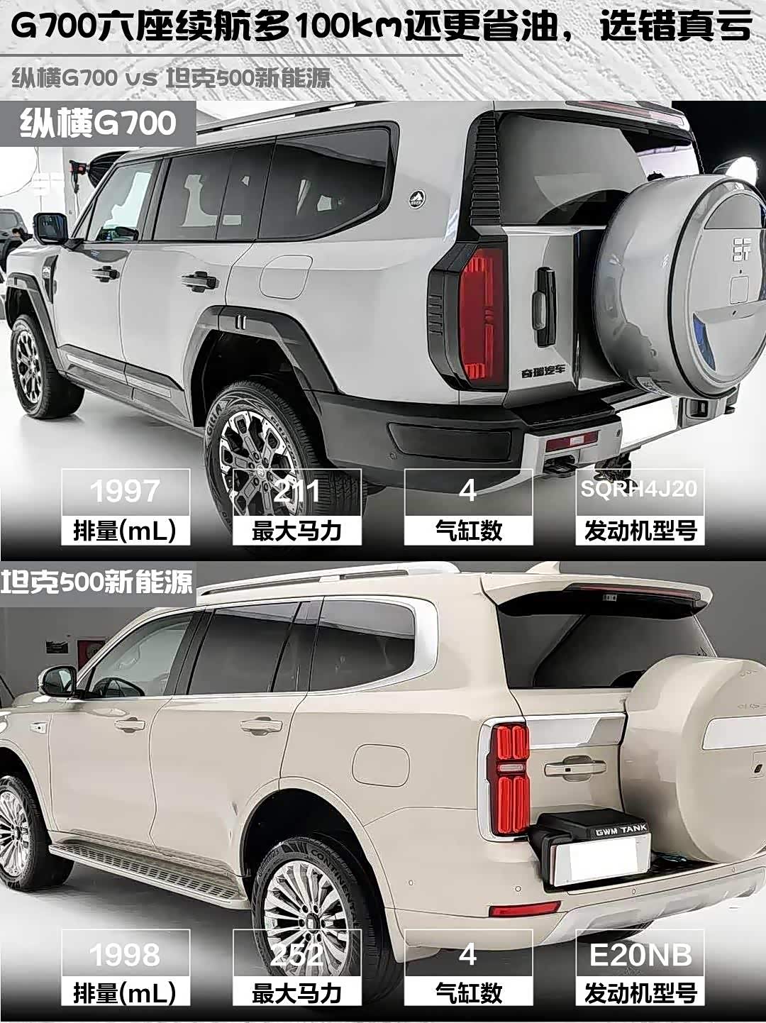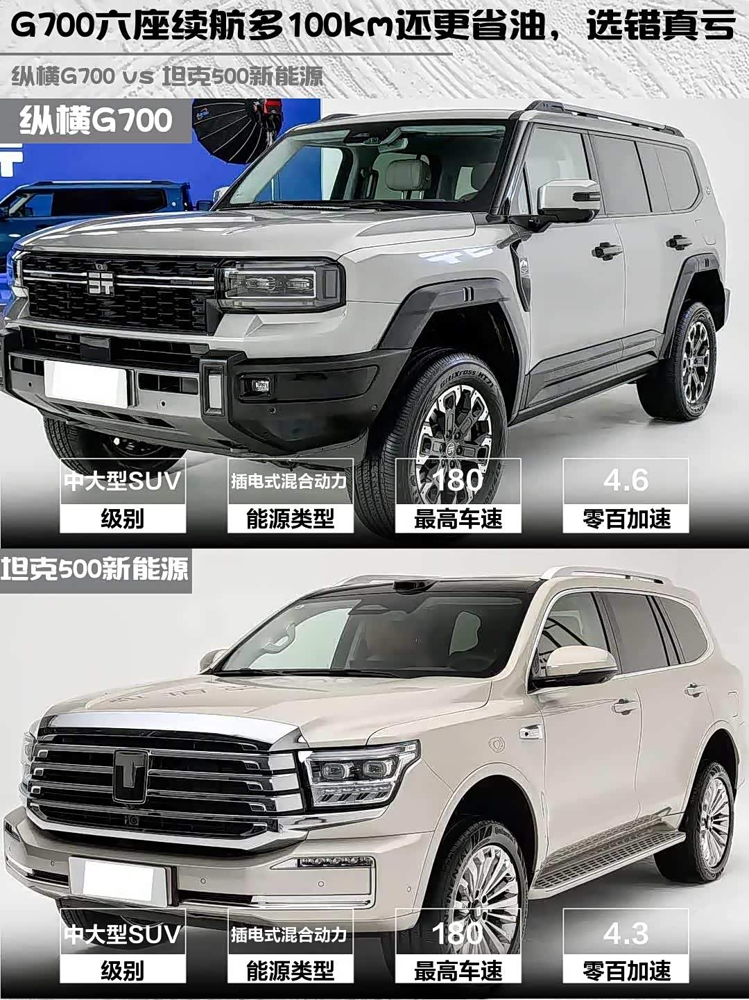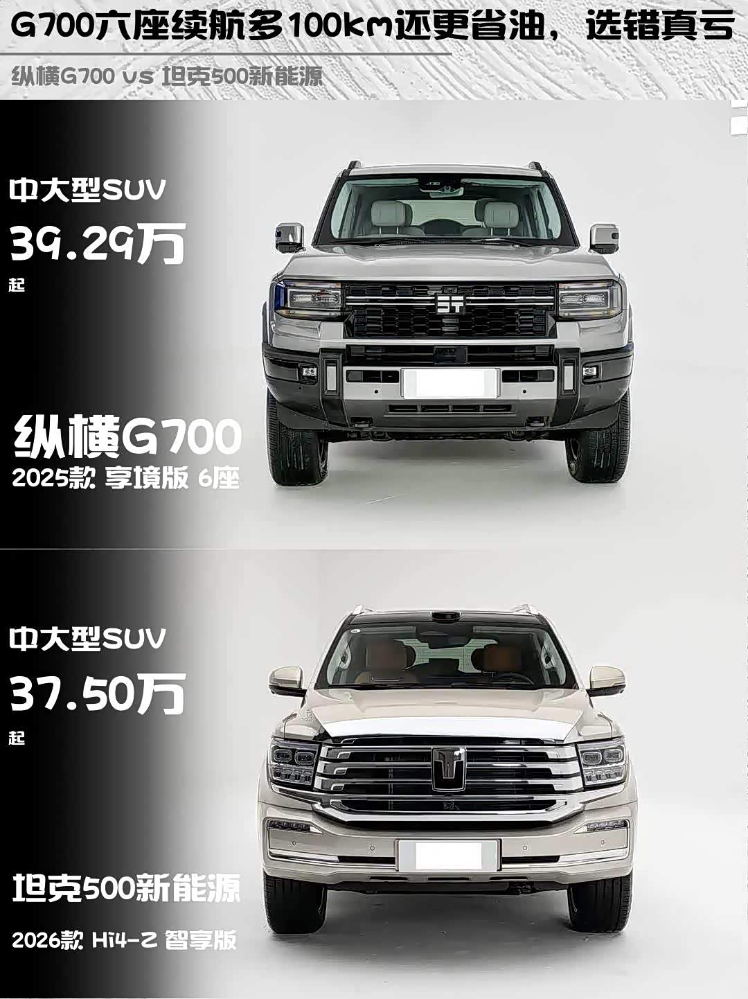 最近在选车的小伙伴看过来!今天给大家深度对比两款热门中大型新能源SUV——纵横G700 2025款 享境版 6座和 坦克500新能源(参数|询价) 2026款 Hi4-Z 智享版,看完这篇你就知道哪款更适合你啦!🔥