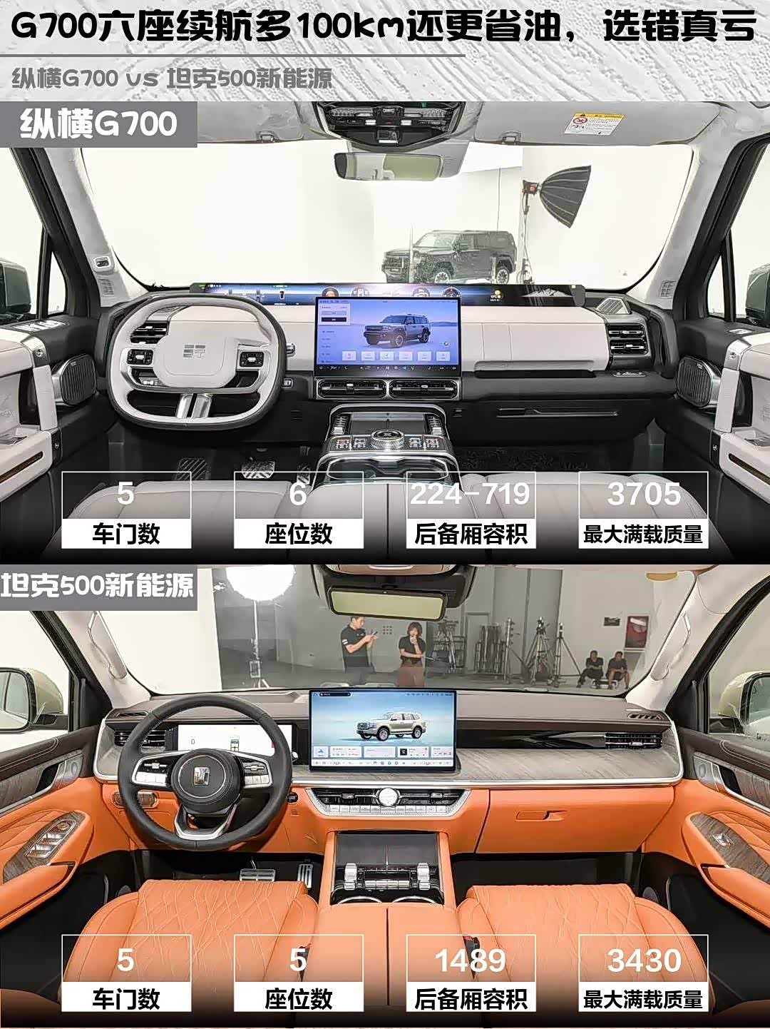 G700主打6座布局,二排独立座椅带加热通风,三排实测坐175cm成人不顶腿,后备箱224-719L灵活可变。坦克500是5座设计,后排能跷二郎腿,但缺少第三排。储物细节上G700门板能塞下5瓶矿泉水,坦克500的冷暖箱倒是露营神器~