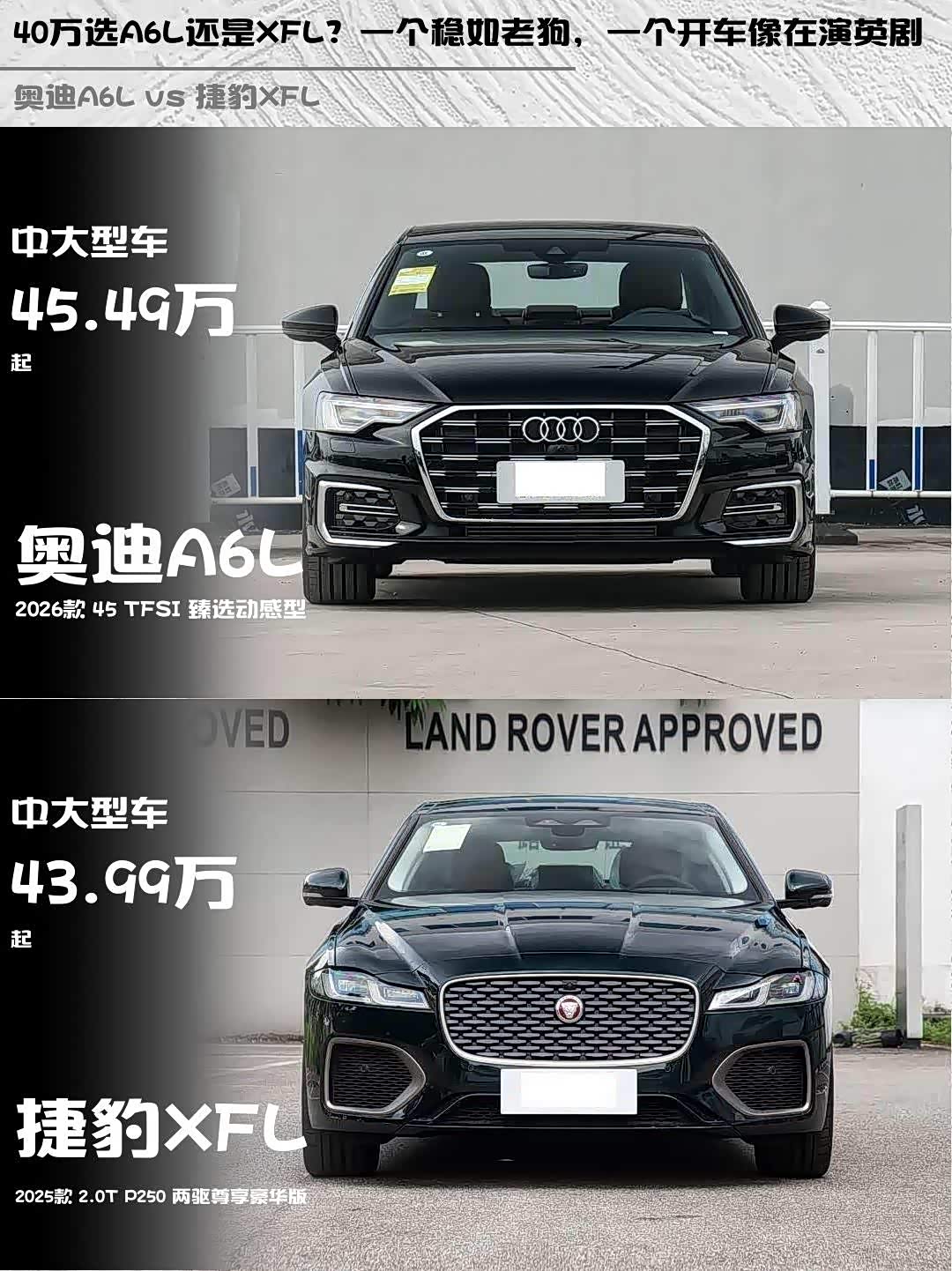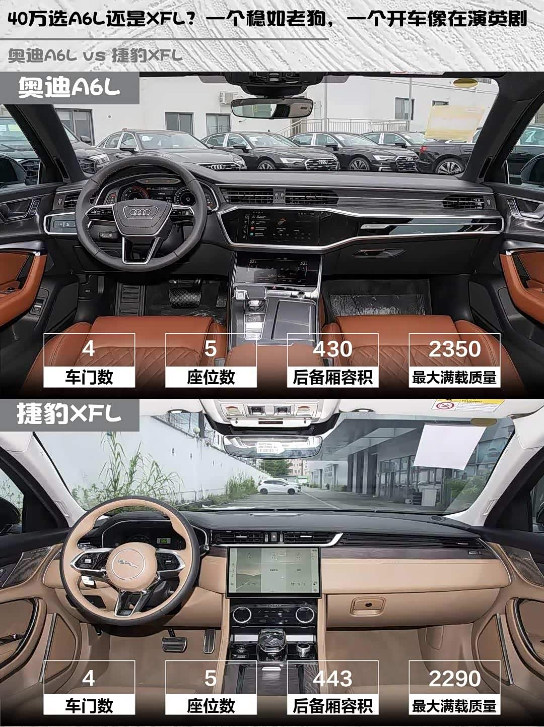 车家号·0浏览·2026-04-06 08:28 · 北京奥迪A6L(参数|询价)和捷豹XFL,这两台40万级豪华轿车到底怎么选?🤔 作为深度体验过两台车的“老司机”,今天就从细节给大家扒一扒!