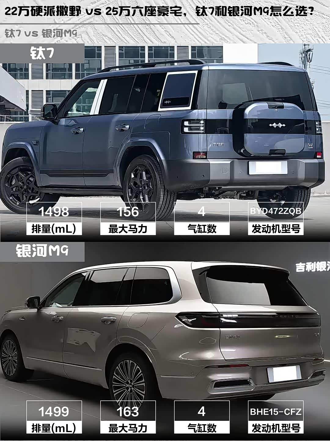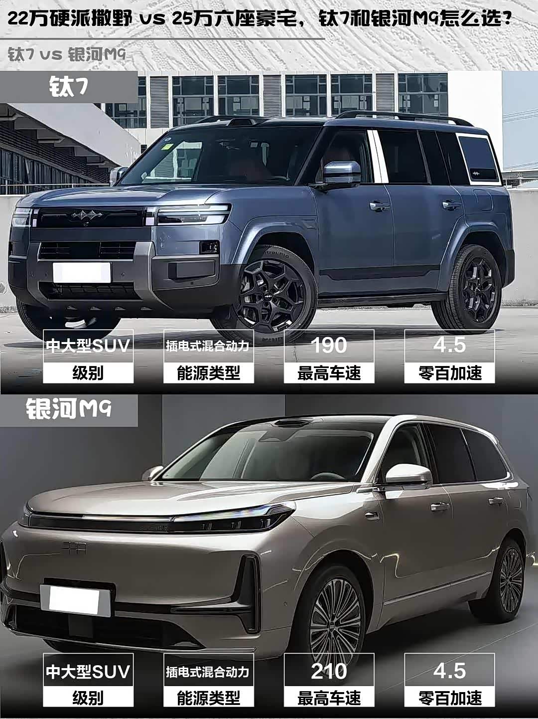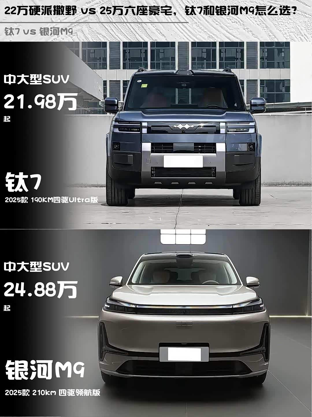 最近在选车的小伙伴看过来!今天给大家深度对比两款热门中大型混动SUV——方程豹钛7 2025款 190KM四驱Ultra版和 银河M9(参数|询价) 2025款 210km 四驱领航版,都是25万级实力派选手,但性格完全不同!🚗💨