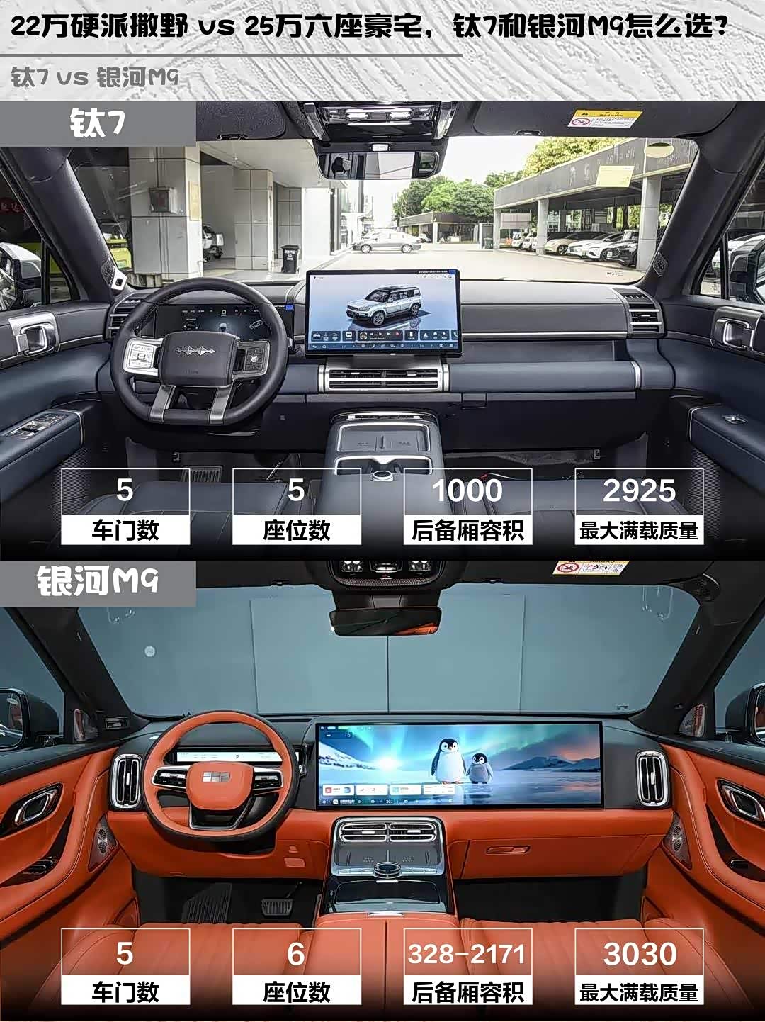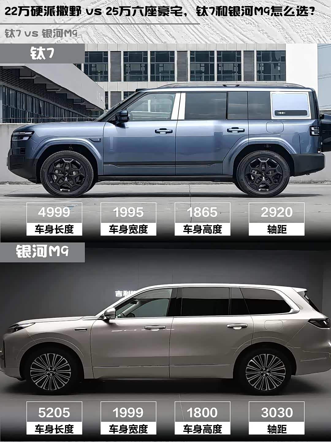 个人觉得钛7更适合年轻人撒野,22万就能拿下方盒子造型+4秒级加速;银河M9则把全家出行体验卷到新高度,三排座椅都能舒服坐成年人。你们更倾向哪款?评论区聊聊~(悄悄说:我都试驾过,钛7的曜石黑车漆实车比图片帅10倍!)