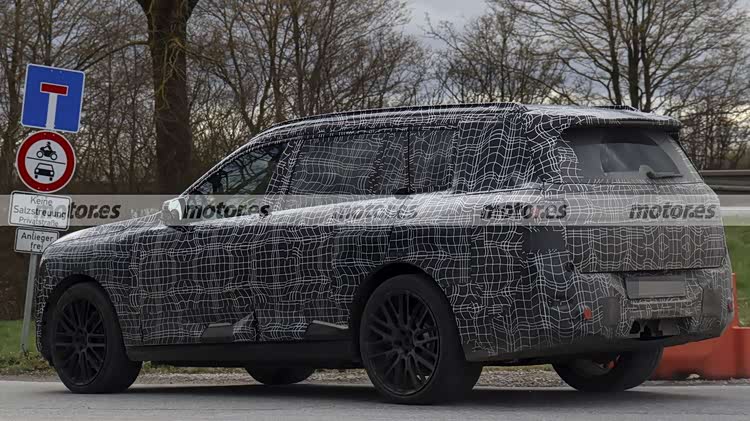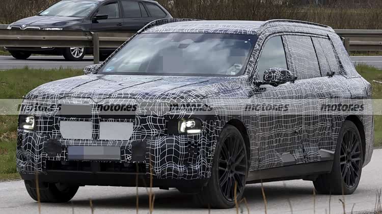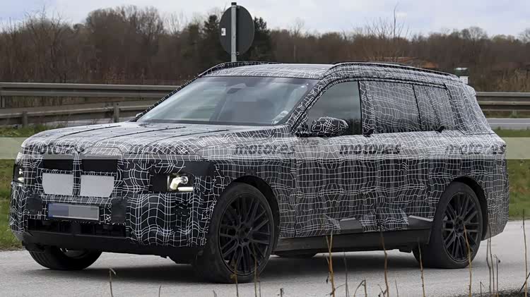 从谍照,新车目前还处在高度伪装状态,但部分细节已经清晰可见,前脸保留了双肾型格栅,但并不一定是最终状态,而且内部应该会是封闭式结构;大灯组采用了分体式造型,但和现款宝马X7略有不同,日行灯应该还是眯眯眼风格,但远近光灯的风格要粗犷不少。