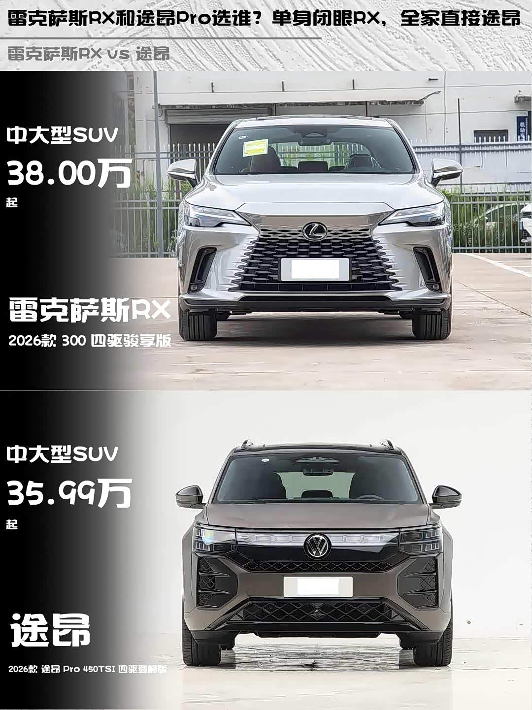 最近后台好多兄弟问 雷克萨斯RX(参数|询价) 2026款 300 四驱骏享版和途昂Pro 450TSI四驱登峰版怎么选?作为深度体验过两台车的"老司机",今天直接上干货对比!🔥