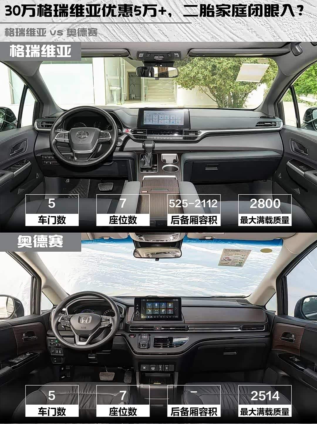 格瑞维亚座椅填充更厚实,连续开3小时不腰疼;奥德赛第二排带腿托调节,午休能躺平。不过隔音方面,两台车高速风噪都不小,建议提车就做全车隔音!