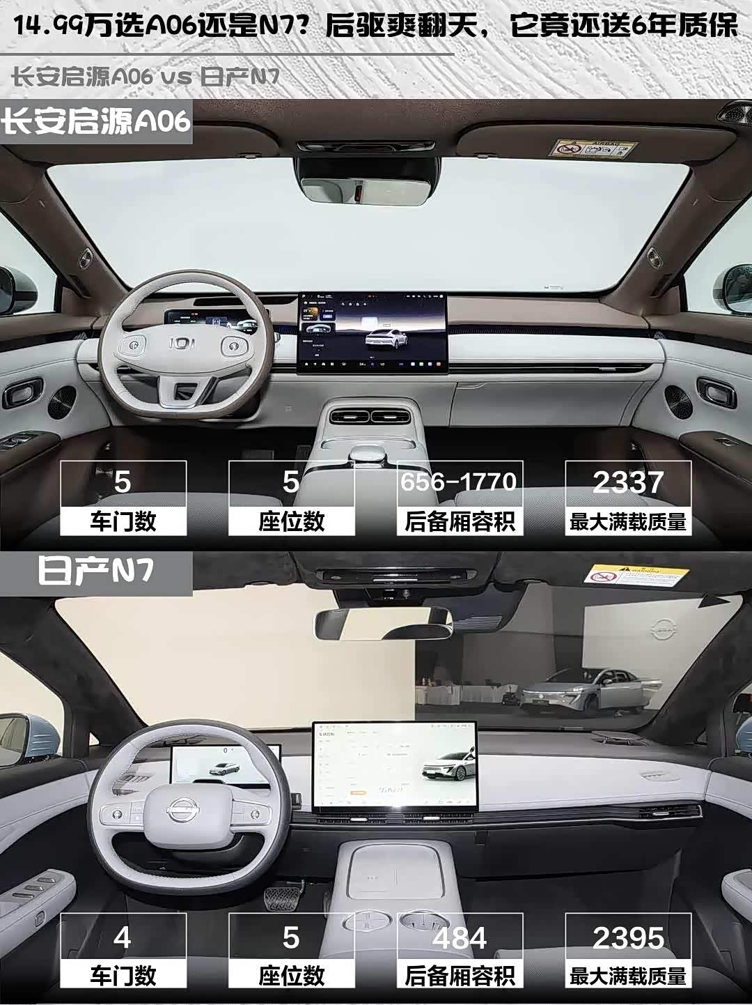 指导价都是14.99万,但A06现在有厂补+地补能省近2万,还送6年15万公里质保。N7的置换补贴最高3万,不过整车质保只有4年12万公里。