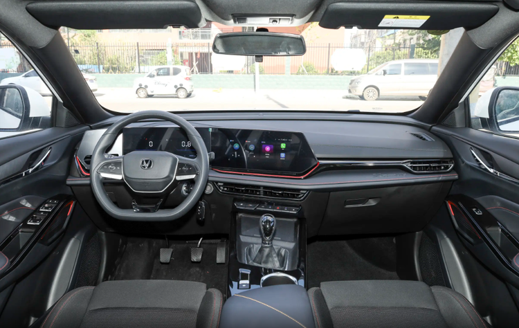 接下来我们再来欣赏内饰设计,不同车型版本所搭载的配置有所不同,因此中控台布局也略微有所区别,不过即便是入门级车型,也搭载了10.25英寸中控屏和彩色行车电脑显示屏,两块屏幕连接处带有一定夹角,虽说看起来不够高级,但参考它的售价之后好像没什么好挑剔的。不过低配版本的科技配置确实有些欠缺,从中高配车型开始才支持语音识别、车联网、OTA升级、手机APP控制等常规智能化配置,进一步提升用车便利性。