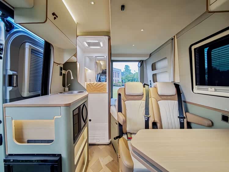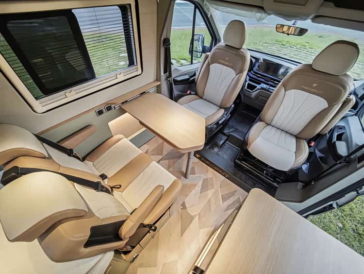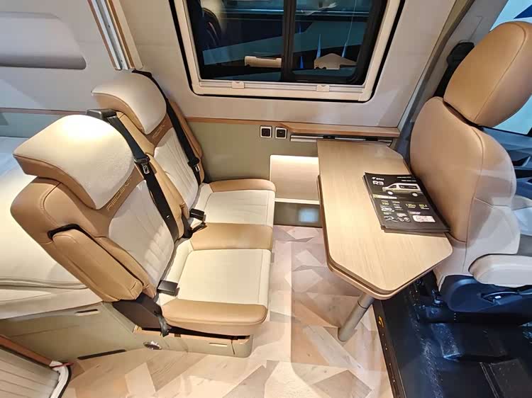 生活区规划清晰合理,采用4座纵床布局,兼顾乘坐与休息需求。驾驶室两人座与第二排两人座搭配,中置厨房、后方纵床和卫生间的布局,充分利用了车内空间。上车对面是双人座椅与延伸桌板组成的会客区,座椅包裹性强,乘坐舒适,延伸桌板展开后可满足用餐、办公等需求。小餐桌外侧经过双切角处理,极大地方便了人员的进出,且采用延伸式设计,进一步提升了使用的便捷性与舒适度。