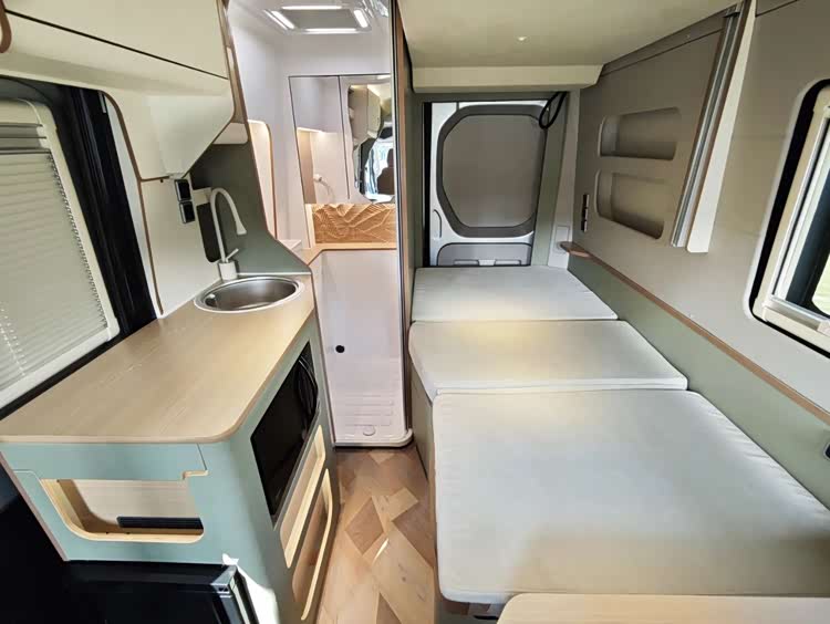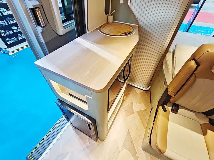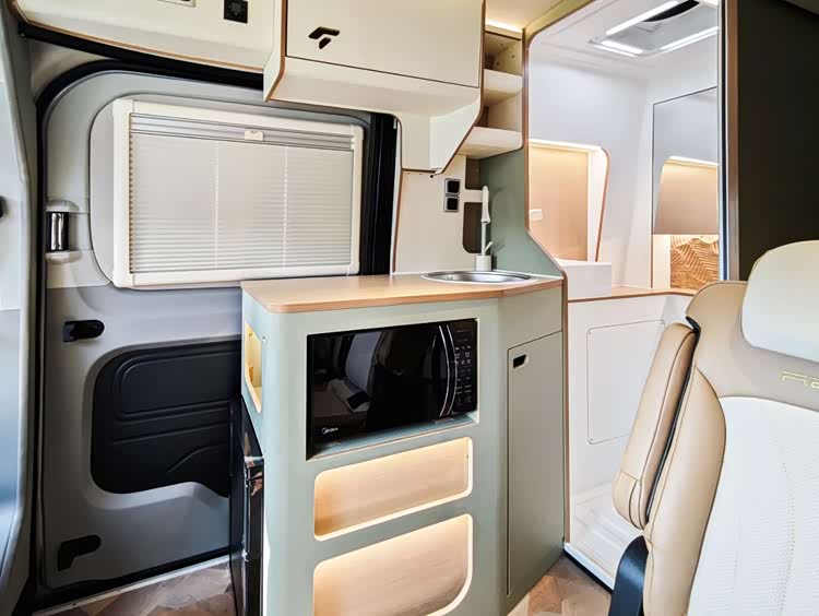 上门处设置室内厨房区,配备洗菜池、微波炉和50L房车专用双向开门冰箱。洗菜池满足日常洗漱、洗菜需求,微波炉可快速加热食物,冰箱则能储存食材、饮料等,满足旅居途中的饮食需求。厨房操作台面设有洗菜池,电磁炉采用模块化设计,集成在侧方操作台中并采用隐藏式抽拉结构,节省空间且方便使用。厨房内部配置多个储物柜,便于收纳厨具和食材。