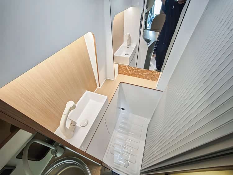 卫生间采用固定式结构,其门采用了独特的卷帘门防水设计,不仅防水性能出色,而且门框设计为下窄上宽的样式,有效节省了空间。卫生间内部空间宽敞,宽度恰好能容纳一名成年人自然伸展双臂。在配置方面,卫生间内配备了盒式坐便器、固定式洗脸盆以及顶部的换气扇等基础设施。淋浴系统还特别安装了稳压罐,以确保在洗澡时能够提供稳定且充足的热水,需配合便携式马桶使用,兼顾实用性与灵活性,适合不同露营场景。