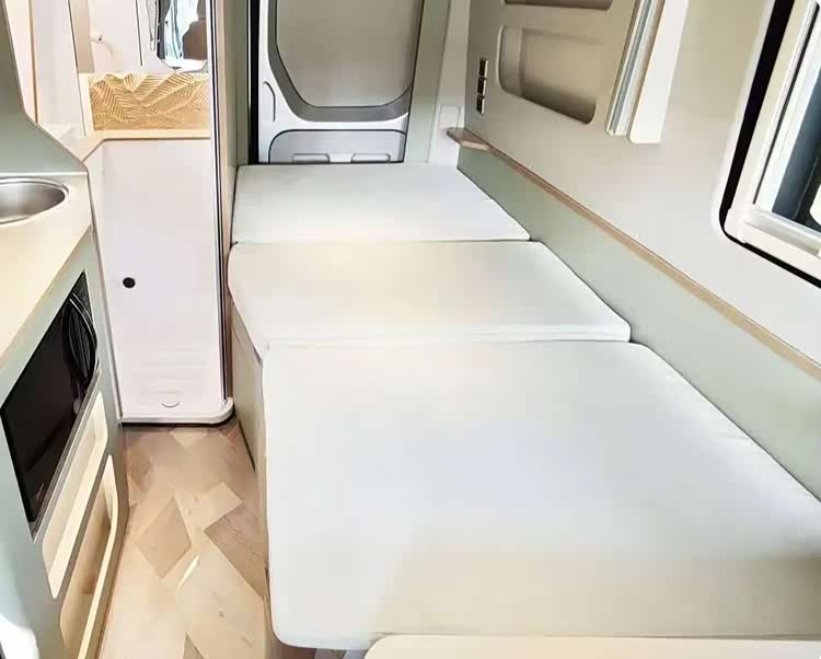 越界R3房车精心配备了两张床铺,满足不同人员的休息需求。其中一张床铺是由第二排座椅放倒后形成的,其最大尺寸可扩展至2000×1000mm,提供宽敞舒适的休息空间。另一张则位于车辆顶部,是电动吊床设计,其最大尺寸达到1800×850mm,足以满足两人的常规休息需求。无论是家庭出游还是朋友结伴,都能找到适合自己的休息方式。