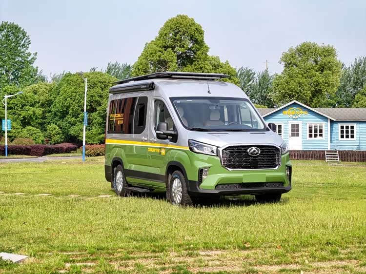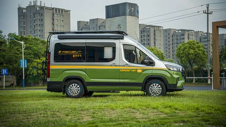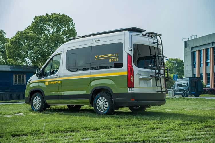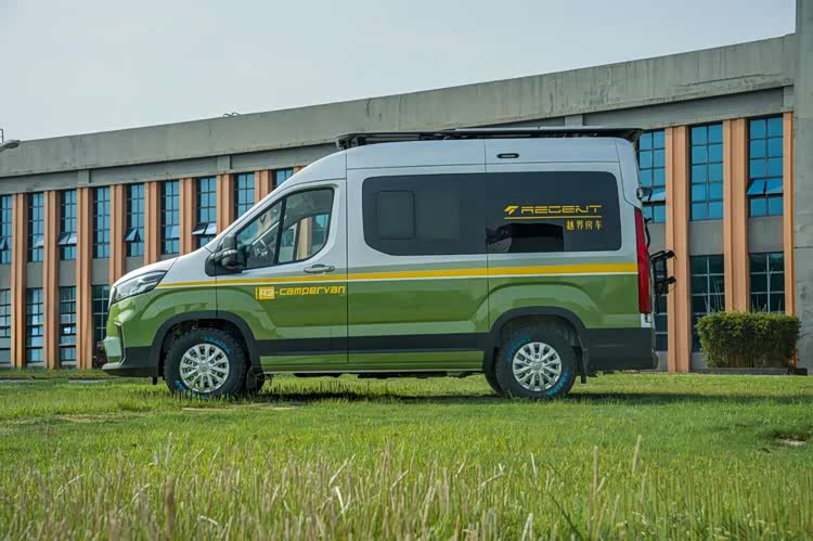 越界R3房车车身尺寸为5180×2062×2580mm,加装后爬梯后长度延伸至5380mm,在B型房车中堪称紧凑典范。它以豆沙绿为主色调,搭配银色与黄色装饰条的双拼色拉花设计,瞬间洋溢着青春与活力的气息,打破了传统房车的沉闷感,兼具时尚感与辨识度。用户还可个性化选装AT轮胎与定制轮毂,进一步强化越野风格,满足不同消费者的个性化需求。