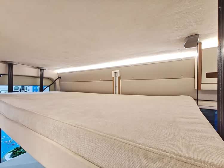 车内采用“小而美”的布局理念,生活区选用越界专属时尚配色,搭配房车专用E0级环保肤感轻质板材,既保证了视觉美观,又具备环保、耐用的特点,有效提升居住舒适度。48V变频空调内机巧妙嵌入驾驶室顶部夹层,兼顾功能与美观。