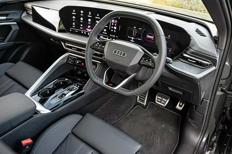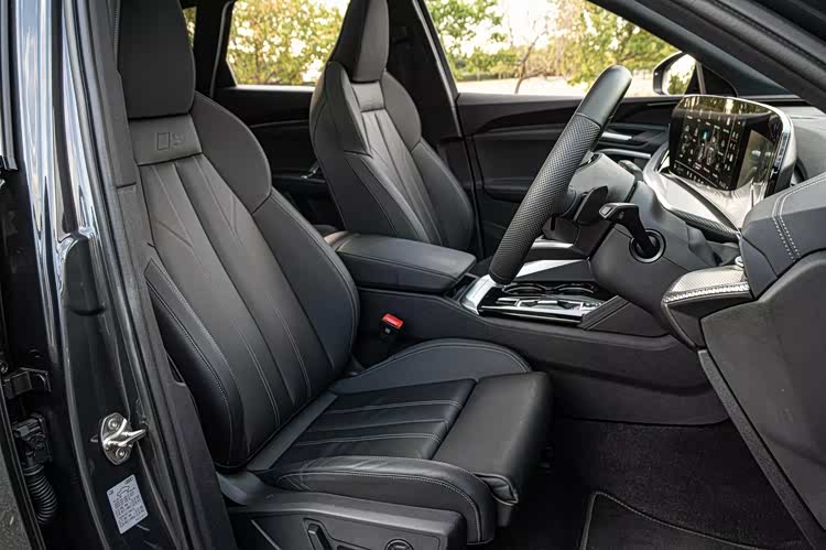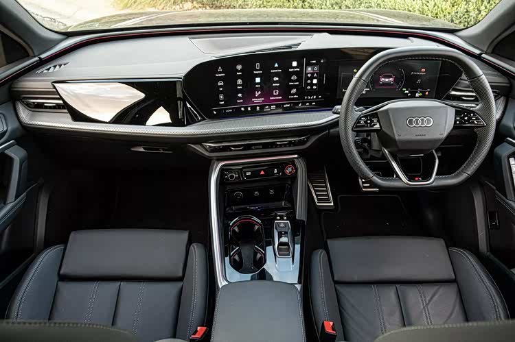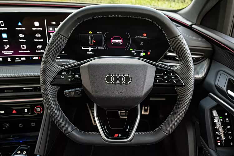内饰部分,实拍车型为右舵布局,但是整体设计也不会和国内版本有太大的不同,只是换了个方向,悬浮式弧面双大屏有着还算不错的显示效果,副驾驶座娱乐屏不会缺席,环抱式的中控台面有着层次感丰富的装饰,气氛灯带简洁而时尚,平底方向盘当然强调了运动的属性,拨杆式换挡得到了延续,由于只是SQ5车型,还是预留了较大的空间,并没有特别夸张的碳纤维或是翻毛皮覆盖,只是在例如一体式运动座椅打孔方向盘等设计,彰显运动的姿态,相当的克制。