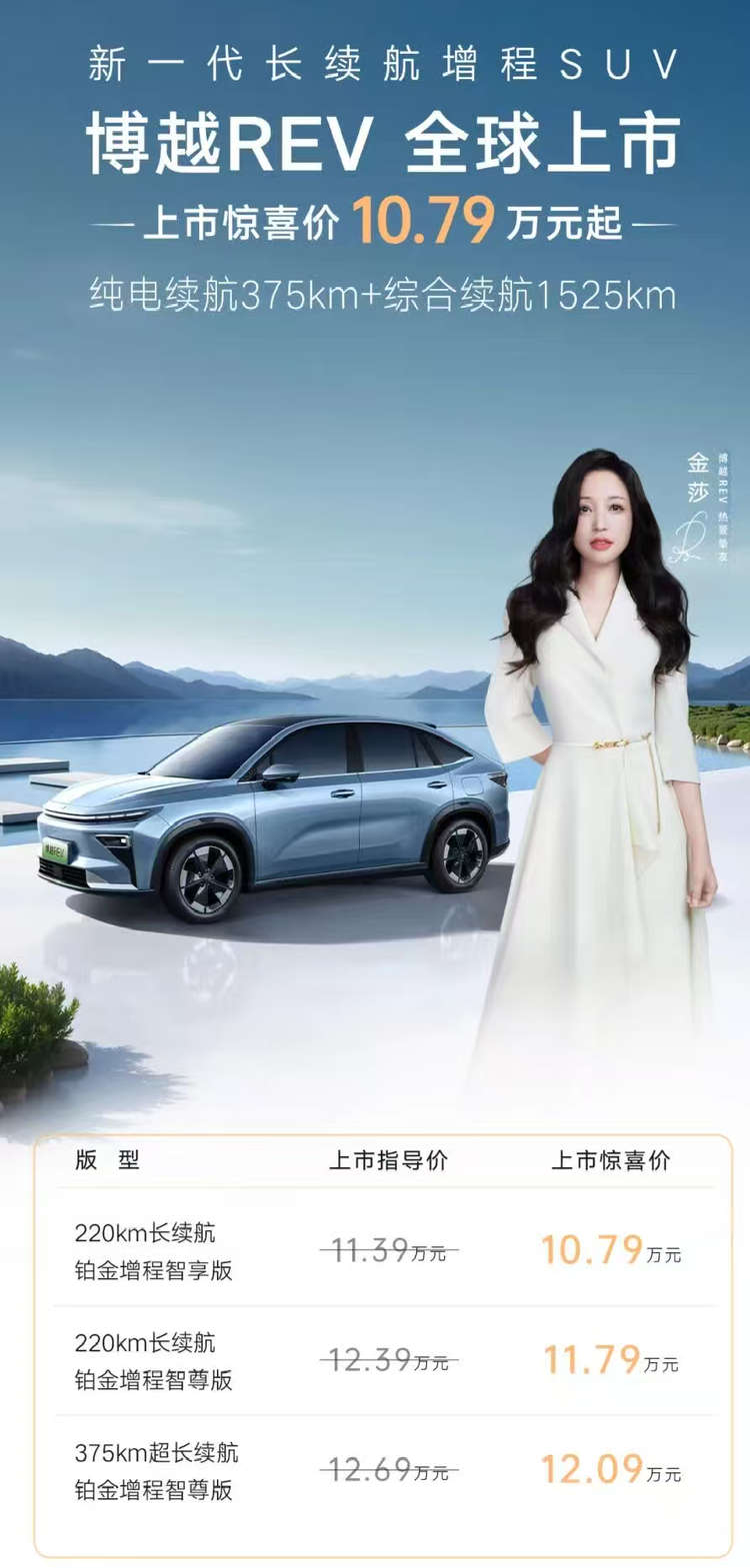【新车导购】日前,吉利 博越REV(参数|询价)正式上市,新车共推出3款车型,上市指导价11.39-12.69万元,上市惊喜价10.79-12.09万元。新车为增程SUV,纯电续航最高可达375公里,综合续航最高可达1525公里。
