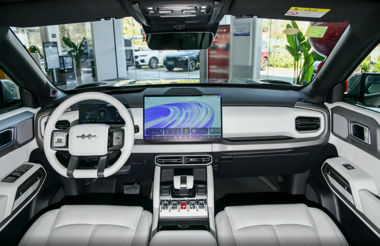 内饰方面的话,方程豹钛3闪充版同样是延续了以往的设计风格,整个中控台的布局非常简约,并且标配了15.6英寸的悬浮式中控屏。而除此之外,颇有质感的水晶按键,以及“战车挡把”和中控台两侧的C形星际氛围灯,这些设计元素也都可以提高车内的档次感。而且在功能配置上,方程豹钛3闪充版标配方向盘加热、座椅通风加热(前排)以及12英寸HUD、50W手机无线快充和540°全景影像。另外,还标配天神之眼C驾驶辅助系统,高配车型还有14个扬声器的帝瓦雷音响以及智能车载冰箱,这些配置也都进一步丰富了的用户的日常出行体验。