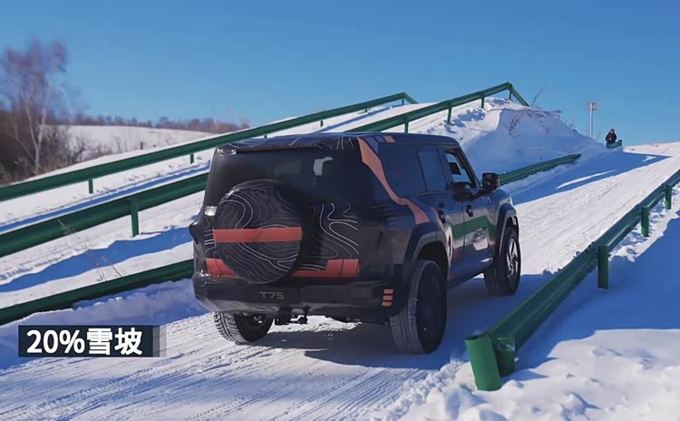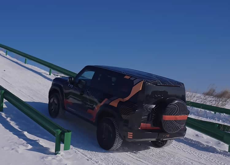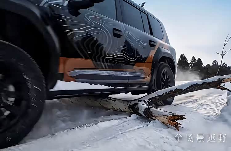 在车的尾部,我们可以看到新车采用的是非常厚重的设计,新车有外挂式的备胎,还有侧开的尾灯,车尾灯组也采用突出的设计,最底端是突出的保险杠,它的后悬很短,这也就让它的接近角很大,通过性非常强。此外,我们可以看到新车还有侧踏板的设计,后侧左右的翼子板的位置分别有加油口和充电口,并且我们还可以看到新车的通过性确实不错,此外它的性能强,适应烂路的能力好。