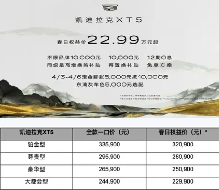车家号·0浏览·2026-04-06 15:45 · 黑龙江日前,Auto情报处从凯迪拉克官方处获得了, 凯迪拉克XT5(参数|询价)的最新购车政策,凯迪拉克XT5定位中型豪华SUV,指导价为37.99万元-45.99万元,春日限时权益价22.99万元-32.09万元,相比之前的全款一口价再降1.5万元。