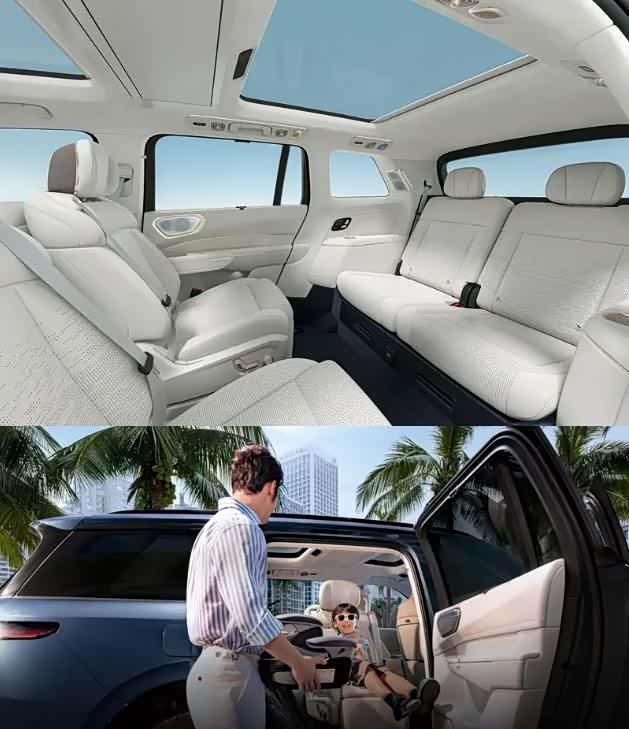 领克900的空间设计堪称一大亮点。其车身尺寸为5240/1999/1810mm,轴距达到3160mm,为车内空间奠定了宽敞的基础。车内采用六座布局,第二排座椅支持180°旋转,这一设计在实际使用中非常实用。当全家出行需要休息时,第二排座椅旋转后可与第三排形成一个类似小型会议室或娱乐室的空间,方便家人之间的交流互动。此外,第三排座椅放倒后可形成2.2米的纯平“大床”,无论是孩子还是大人都能舒适地躺卧休息。这种灵活的空间布局,让领克900在应对不同出行需求时都能游刃有余。