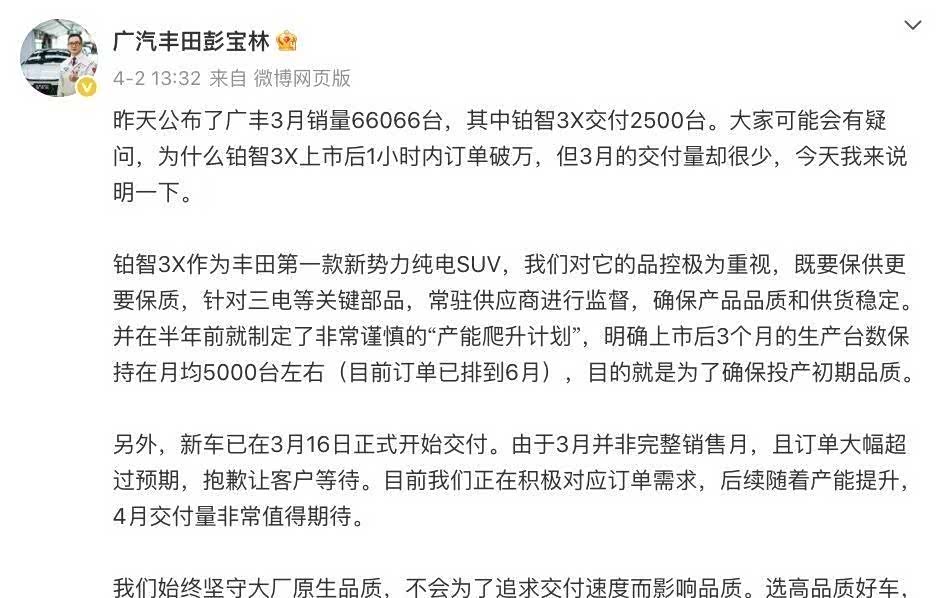 最近常看到这样的景象:4S店里的顾客不再只是围着展车转悠,而是直接掏出手机扫码下订。 铂智3X(参数|询价)上市现场,销售顾问的平板电脑上订单数字以肉眼可见的速度跳动,短短一小时后台就涌入一万个预订请求——这并非虚构场景,而是2025年新能源市场火爆的日常切片。当广汽丰田副总经理彭宝林在微博透露铂智3X大定订单突破1.5万辆、生产计划排到六月时,这个数字背后藏着更深的意味:合资品牌正用技术创新叩开新市场的大门。